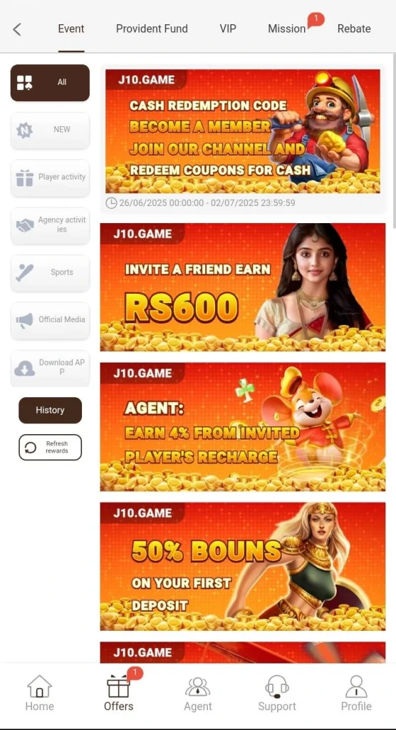 J10 allows players to invite friends using a referral code. When friends join and play both players receive bonus tokens.